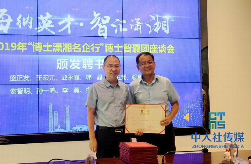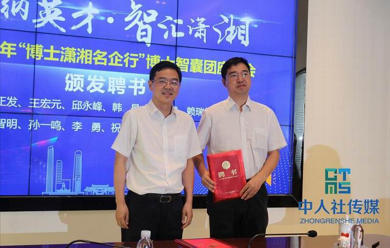 中共湖南省委组织部人才工作办主任谢忠阳(左)为博士智囊团成员颁发聘书