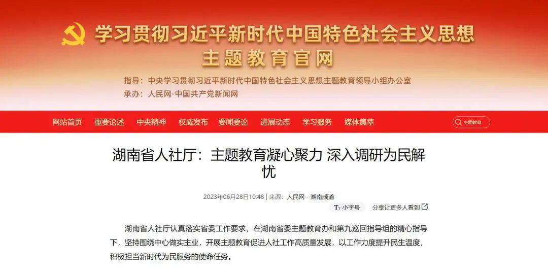 2023年6月7日,省人社厅在全省主题教育工作推进会上作典型交流发言。6月28日,中央主题教育官网以“主题教育凝心聚力,深入调研为民解忧”为题刊发我厅做法。