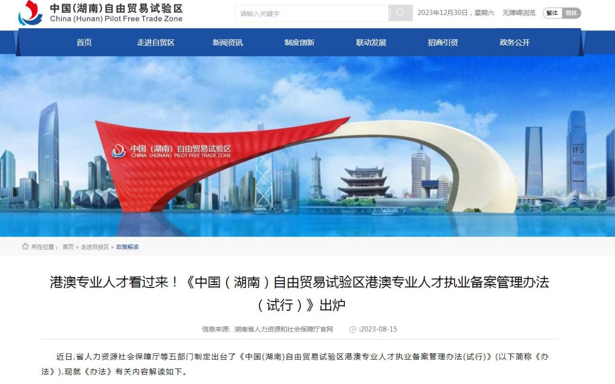 分类推进人才评价机制改革。出台《在职称评审中破“四唯”强化实干实力实绩评价的实施意见》;首次开展工程领域高技能人才贯通专场高级职称评审;高级职称实现网上申报评审;8项港澳执业资格获得中国(湖南)自由贸易试验区认可。