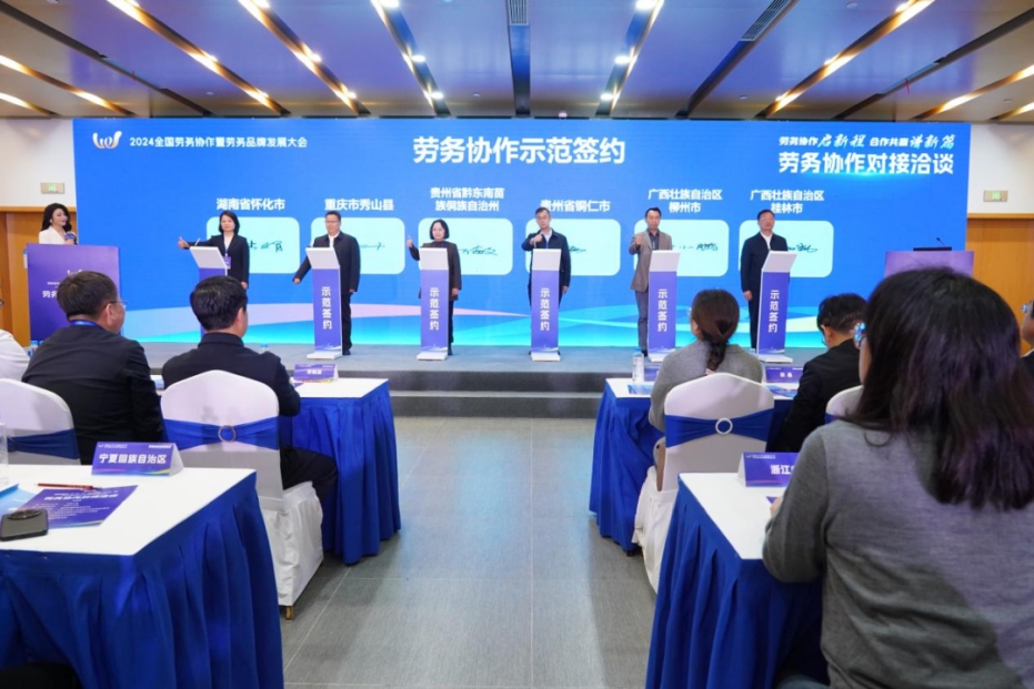 在示范签约环节,云南省和安徽省,宁夏回族自治区和贵州省,辽宁省朝阳市和上海市闵行区,湖南省怀化市和重庆市秀山县、贵州省黔东南苗族侗族自治州、贵州省铜仁市、广西壮族自治区桂林市、广西壮族自治区柳州市,河北省石家庄市和山东省青岛市,重庆市开州区和山东省潍坊市,福建省漳州市长泰区人民政府和湖南省长沙市长沙县人民政府分别签订劳务协作协议。