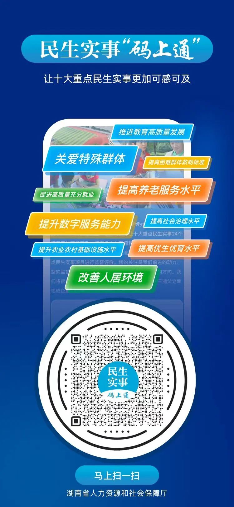 今年,省委、省政府决定继续办好“十大重点民生实事”。您可以通过扫描“民生实事码上通”二维码或者登录“智慧人社”APP,直接查看了解2024年全省十大重点民生实事24个项目的详细信息和最新进度,全省重点民生实事实施情况能够直观生动地展现在您的眼前。二维码将投放到全省重点民生实事项目实施现场,对实事项目实行“亮码实施”,并将“亮码实施”到位率作为群众满意度评价的重要内容。